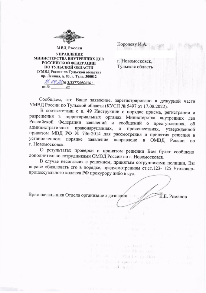 Ответ из управления Министерства внутренних дел Российской Федерации по Тульской области, врио начальника отдела организации дознания Романов К.Е. Сообщение зарегистрировано в УМВД России по Тульской области (КУСП № 5497 от 17.08.2022) и направлено в ОМВД России по г. Новомосковск.